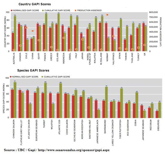 Partant du constat que la pisciculture marine impacte le milieu, des chercheurs ont essayé de classer les différents types de pisciculture marine : saumon, bar, barramundi, cabillaud, turbot…L’objectif est de comparer quantitativement les impacts environnementaux dans la pisciculture marine, d'identifier les plus performantes, et mettre en évidence les solutions possibles. De tout ce travail est né le GAPI : Global Aquaculture Performance Index. Tout ce travail supporté par la grande fondation étatsunienne, The Pew Trust : 2010 Index Global Performance de l'aquaculture