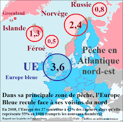 Dans sa principale zone de pêche, l’Europe Bleue recule face à la poussée de ses voisins du nord : Norvège, Islande, Russie et Féroé. Quant à la France, elle semble capituler dans une guerre qui oppose les grandes nations de pêche pour le contrôle de l’Atlantique nord-est, la quatrième zone de captures dans le monde (avec 8,650 millions de tonnes en 2008)