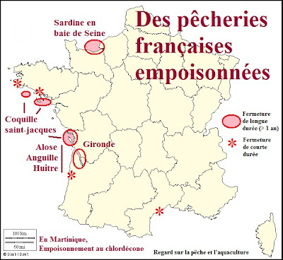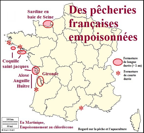 Mais personne ne s’émeut ou ne s’intéresse à la fermeture de la pêche à la coquille Saint-Jacques sur toute la façade atlantique, la fermeture de la pêche à la sardine en baie de Seine, l’interdiction de capture d’alose et d’anguille ou de collecte des huîtres dans l’estuaire de la Gironde. Non pas à cause de la surpêche ou de la disparition de ces espèces. Mais, coquille saint-jacques, sardine, alose, anguille et huître sont empoisonnées et donc impropres à la consommation…