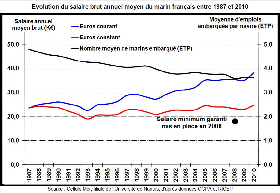 Si on regarde maintenant la répartition de la masse salariale en neutralisant l’inflation sur ces 25 dernières années, on remarque que l’ensemble des marins ont un pouvoir d’achat qui s’est maintenu. Il s’est maintenu par un mécanisme de réduction de parts allouées pour cette masse salariale : le nombre moyen de marins embarqués a diminué. Le salaire brut moyen pêche est d’environ 38K€ en 2010. Si on le compare aux autres secteurs d’activité, il est malgré tout légèrement au dessus de la moyenne (contre 33K€ pour les autres secteurs d’activité en 2010)....